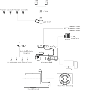 Transmission and reflection frame with low position coaxial focusing mechanism, coarse range: 35mm, fine precision: 0.001mm. Built-in 100-240V wide voltage system, 5W LED warm color transmitted illumination, 1300nm. The reflected illumination and transmitted illumination are independently controllable. Bright field NIR reflected illuminator, with electric variable aperture diaphragm, center adjustable; with switch device for bright field and NIR; with filter slot; with MvImage-Industry software and Dongle. |