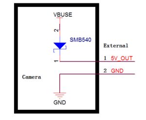 The camera is powered by USB2.0 BUS POWER, the power supply is 5V@500mA, The BUS POWER provide power supply to the camera, at the same time, it provides power supply via diode SMB540, the power is about 200mA@5V.