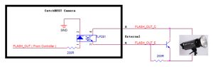 For some flash light which has Rising edge input (We can measure the flash light pin to determine whether there is a Rising edge input, if we have measured a pin has electrical level signal, it can be judged there is Rising edge electrical level internal the flash light, such as the K-150A models flash light, one of the synchronous trigger pin end is + 5V, and the other end is GND), you can use the connection diagram below: